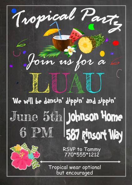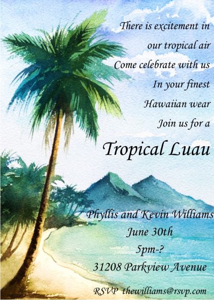 Luau invitations are used for events such as Rehearsal dinners, Engagement parties, Sweet 16 parties, children?s parties, family reunions and the most popular of course, annual summer parties. The Luau theme is very fun and versatile! Using the theme can turn a routine party into a party paradise!